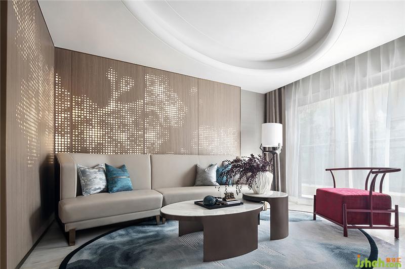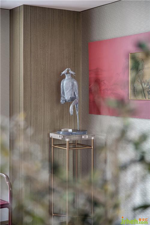 作為家庭溝通情感交流的區(qū)域二層家庭廳,沙發(fā)后墻面背景采用自然花形的沖孔透光木紋鋁板、與飾品器物靈動成趣、高低的茶幾組合讓空間更具有層次感。