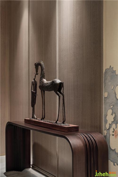 負(fù)二層過道的設(shè)計以“魚翔淺底”為主題,通過藝術(shù)家張華的作品——《云中歌》,結(jié)合大理石墻面及地臺的流水造型,搭配暖色的燈光,自在又安穩(wěn)。表達(dá)出自在悠揚的永恒畫面。人與空間對話,人與物的對話在瞬間定格在剎那。