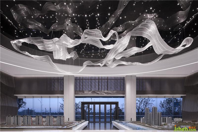 挑空大堂將宇宙的斗轉(zhuǎn)星移幻化于空間之中,有如夜空之中璀璨的星光,飄逸舞動的藝術(shù)燈飾裝置蜿蜒流轉(zhuǎn),如同九天銀河匯入星海,伴隨人影流動,頗有踏月神行、遨游星海的輕盈感??臻g中摒除多余裝飾,光影在有限的空間尺度投射出無限的闊度,于方寸之間,獲得震撼心靈的觀感體驗。