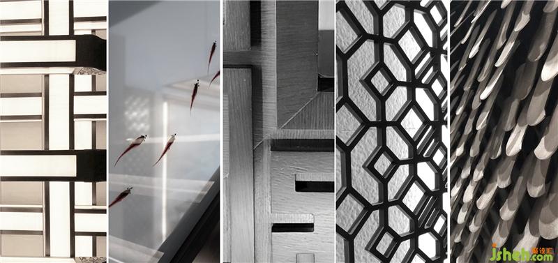 門廳的設(shè)計上,一方八邊鏤空花窗,幾處嶙峋山石,延引嶺南山水入內(nèi);水墨色體塊墻面層次堆疊,頂部融入東方吉祥紋樣,自然生發(fā)空間禮序與入宅儀式感。