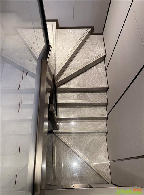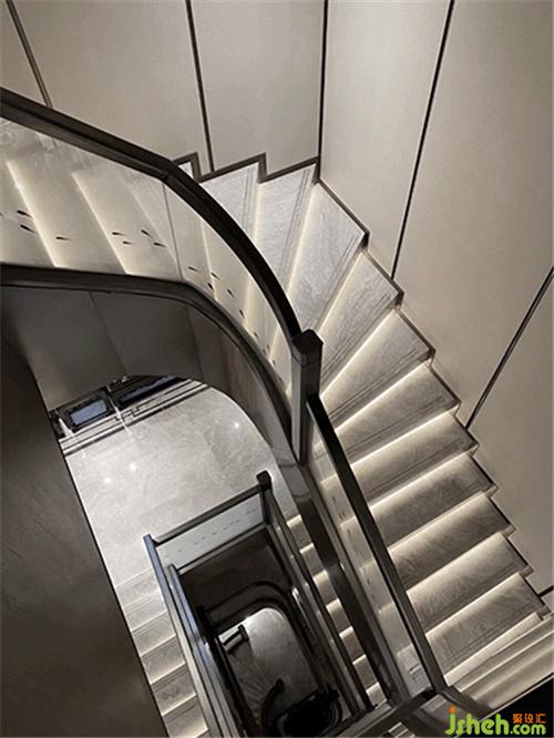 樓梯的打造是空間的重點,采用暖灰色大紋石材鋪設(shè),搭配金色的槽線,含蓄而張揚。夾絲玻璃擋板與古銅鋼框架扶手的組合,有若“淡淡流水載輕舟,悠悠魚兒水中游”。整個樓梯作為空間主軸,上下聯(lián)合,層層疊疊的序列感,衍生空間的意趣。