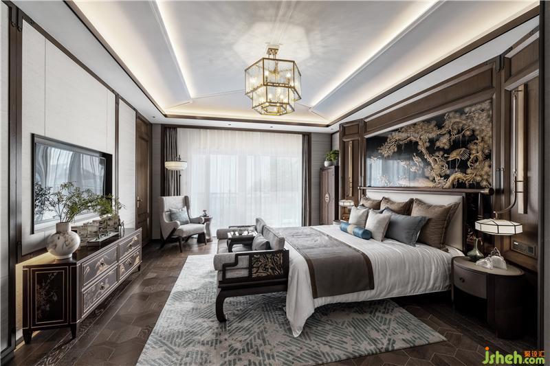 松與鶴喻性高潔,主臥背景墻金箔藝術(shù)漆畫松鶴圖,顯露一家之主對“德”的看重,也是兒孫傳承、家族延續(xù)的核心,“德不孤,必有鄰”,不必陋室,一言一行,一器一物,皆是彰顯。