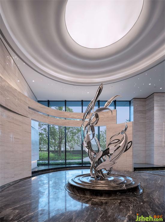 《水經(jīng)注》與《三秦記》中均有大禹鑿門、鯉魚登龍之說。傳說大禹辟伊闕,浪濤翻滾,有黃河之鯉逆行而上,躍而成龍。展示區(qū)以此為靈感,深圳營銷中心設(shè)計(jì)以現(xiàn)實(shí)寫意的藝術(shù)手法打造龍門意象,模擬勾勒群鯉溯回之景,形成鯉魚整體環(huán)游而上的金屬裝置藝術(shù),與圍合片墻“龍門” 形成呼應(yīng),演繹向上與新生。