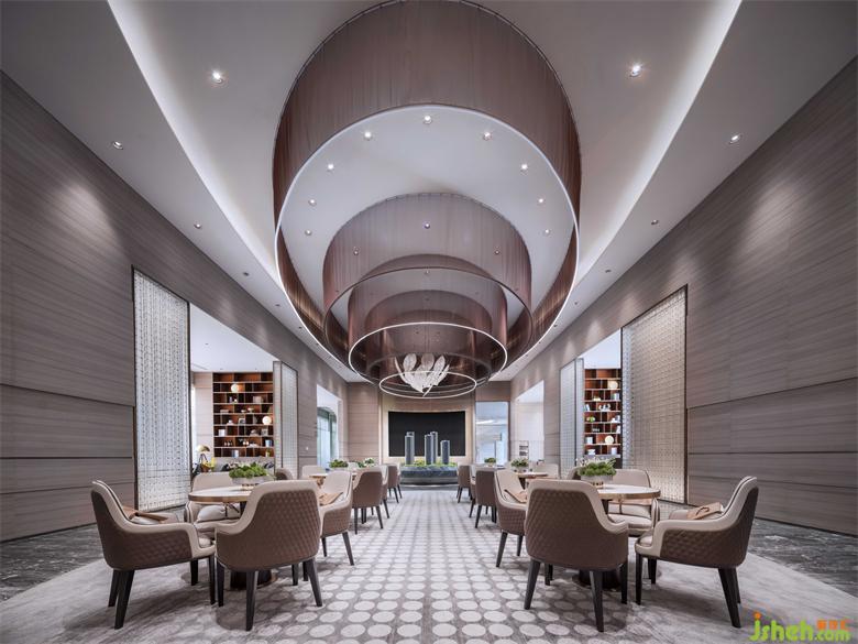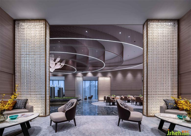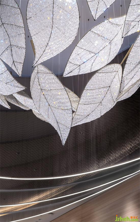 流動是水的永恒,深圳營銷中心設(shè)計提取流水漣漪意象予以藝術(shù)化重構(gòu),將金屬簾以陣列感層層散開,其蜿蜒的形姿于節(jié)奏感中散溢出清透高雅的美感,亦如大地之眼,使空間變得富于張力,也成為空間的靈魂及視覺焦點。