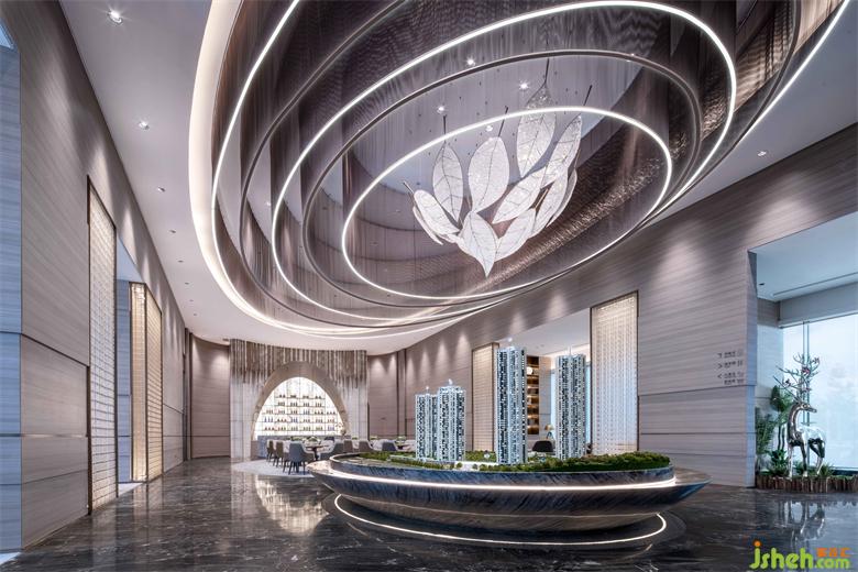 空間本來沒有界限,打破人為的功能限制,深圳營銷中心設(shè)計將水吧與淺洽區(qū)、沙盤展示功能融為一體,把控空間的節(jié)奏,將私密與開闊性控制在微妙之中。通過繁花綻放為主題的藝術(shù)吊飾的相互聯(lián)系,在光影作用下,燈飾、墻面及局部鏡面天花生成幻境般的光影流動。