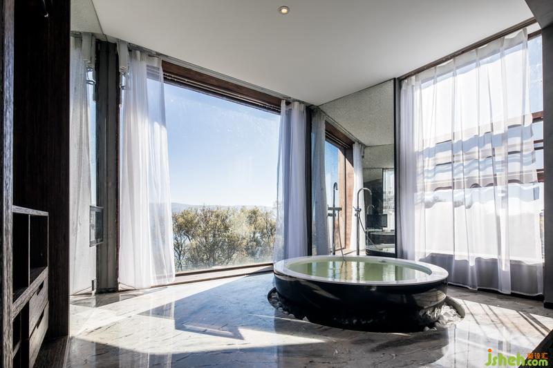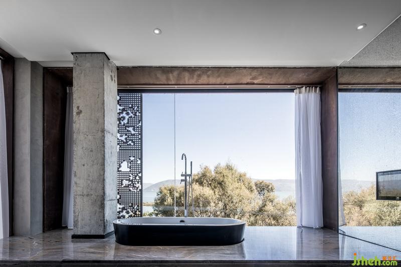 客房的設(shè)計也遵循這個原則。整面的落地玻璃窗,裸露的水泥墻面,白色的天花,把窗外的風(fēng)景放大。窗邊做了觀景臺,浴缸鑲嵌在地面中。泡澡看星空時,沉浸在山海的懷里。