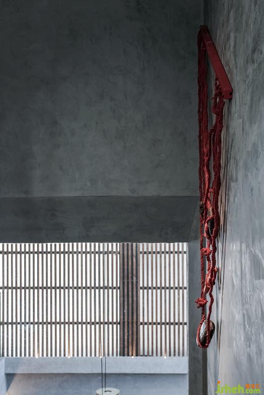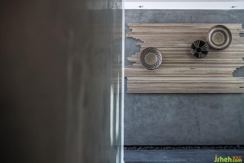 尹盛濤父親是木匠,他曾當(dāng)過幾年的木工學(xué)徒,對木頭有著深厚的感情??蜅S昧舜罅康哪靖駯叛b飾墻面,可變換不同的造型。溫潤的木頭和裸水泥墻面、青石板地面碰撞,彰顯材質(zhì)本身的美感。