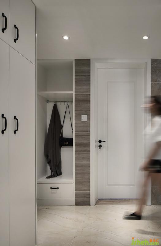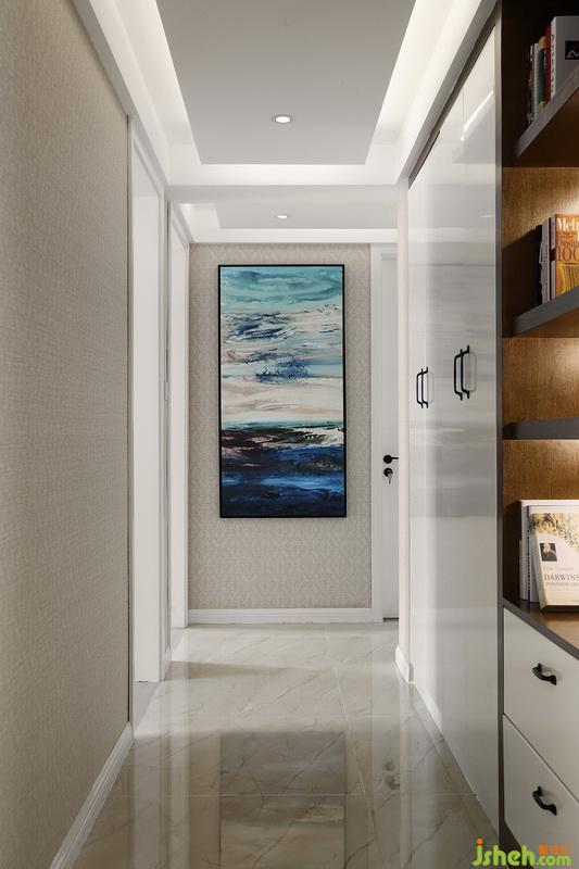 入戶走廊一副掛畫美化空間視覺,同時(shí)右側(cè)空間室內(nèi)設(shè)計(jì)師設(shè)計(jì)了一排收納柜,最大化利用走廊空間。