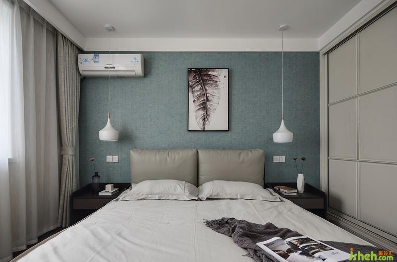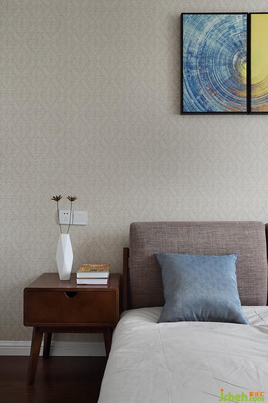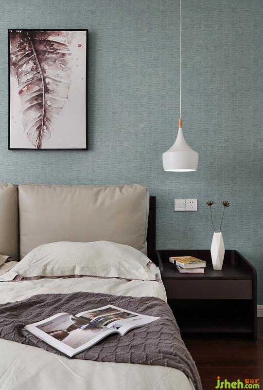 主臥墻紙的顏色淡雅柔和,一副不對稱掛畫讓空間不再循規(guī)蹈矩。