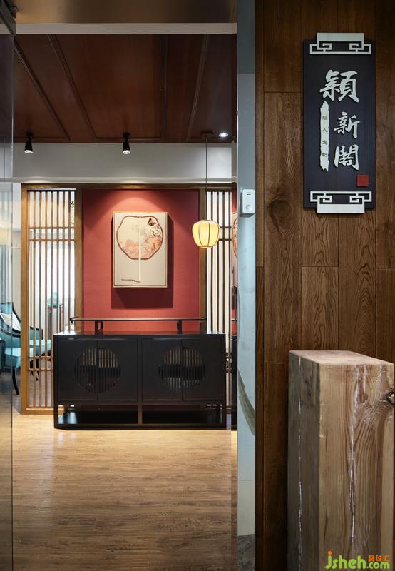 進(jìn)門入戶醒目的店名logo,中式韻味總能沙發(fā)出濃濃的高級感。近戶門口走廊的護(hù)墻板隔斷選用了一副梅花掛飾和玄關(guān),呼應(yīng)相得益彰。