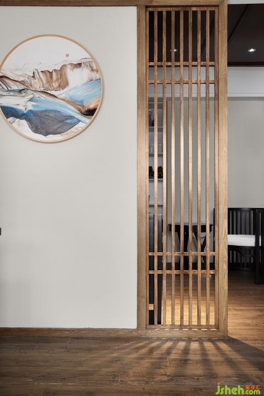 木質(zhì)隔斷備受歡迎,讓來訪者賞心悅目。搭配一副抽象掛畫,和木質(zhì)隔斷相互統(tǒng)一。一盞簡約中式小吊燈,簡約大方。