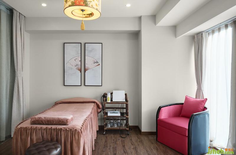 因?yàn)槭桥责B(yǎng)生會(huì)所,因此選擇了白色的墻壁搭配粉色系的床和單人沙發(fā),整個(gè)空間和諧統(tǒng)一,賦予一種小資感,令來(lái)訪的客戶可以得到片刻的寧?kù)o和享受。