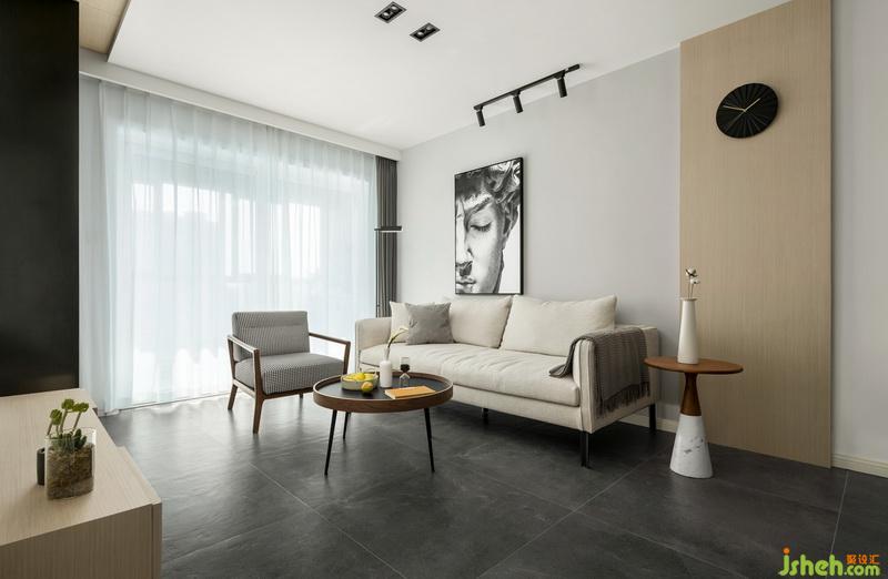 客廳吊頂拉平,無主燈。光源用落地?zé)?、射燈、筒燈結(jié)合,局部分散照明可以讓空間更有層次感。地面深色調(diào),整個(gè)墻面空間都是大面積留白,局部搭配木飾面,想要表達(dá)的效果是、穩(wěn)、空、質(zhì)。布藝米白色沙發(fā)、灰色窗簾,線條落地?zé)?、個(gè)性掛畫、與空間里的木色元素搭配,讓硬朗與柔和的交融。