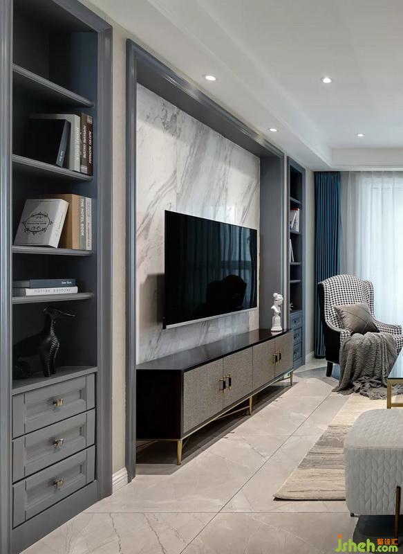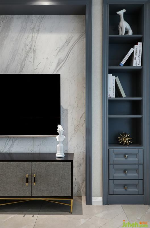 向后拓展的電視背景墻“掏”出來(lái)的電視背景墻,實(shí)現(xiàn)了不占空間又可以放置大量的物品。
