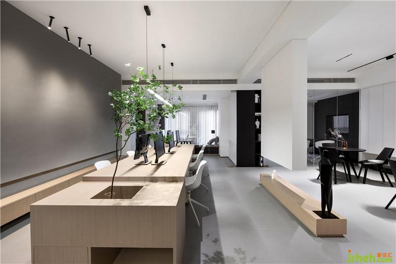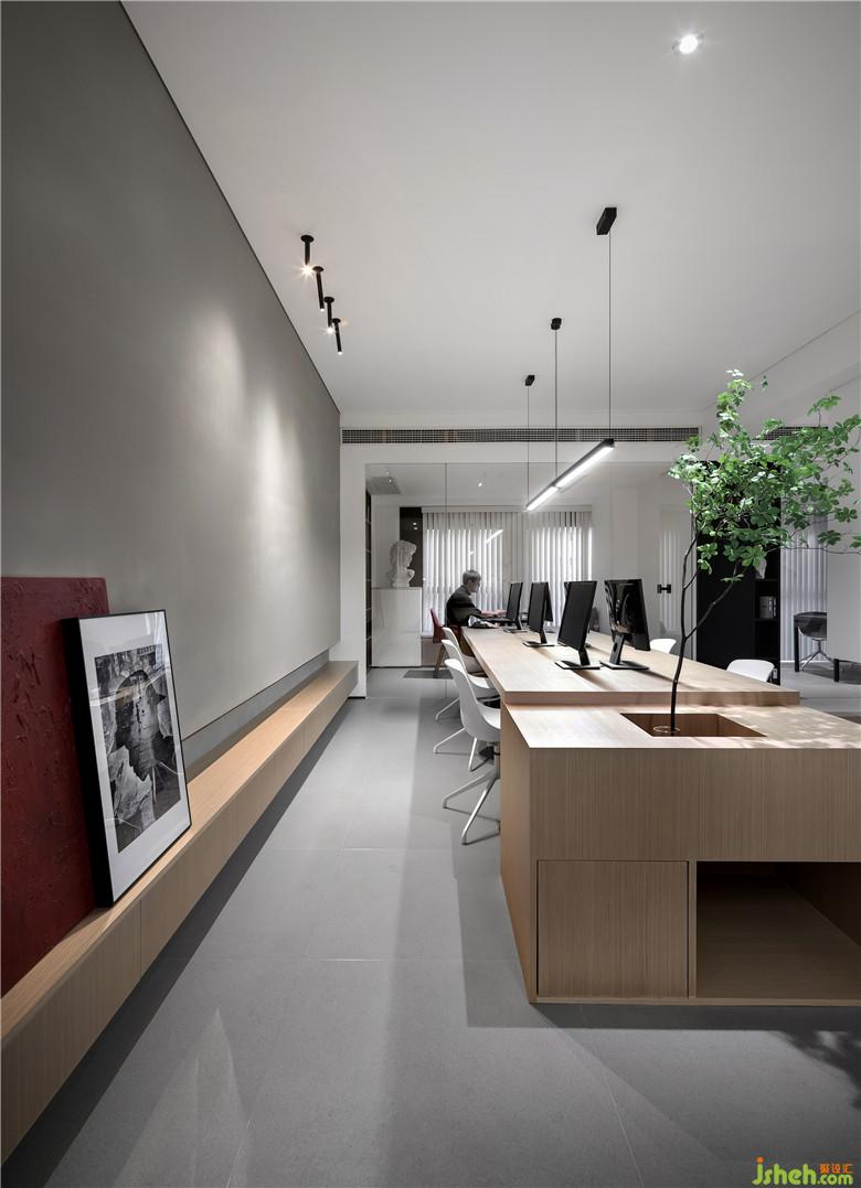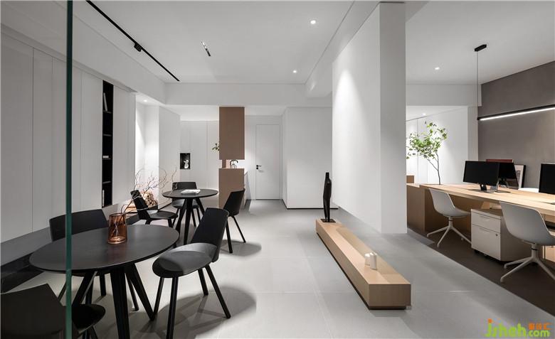 本案戶型原為兩個同戶型公寓,把中間墻體打通,做成半藏半顯隔斷,分為兩個區(qū)域,洽談區(qū)和辦公區(qū),視覺有連貫又有相對安全空間。