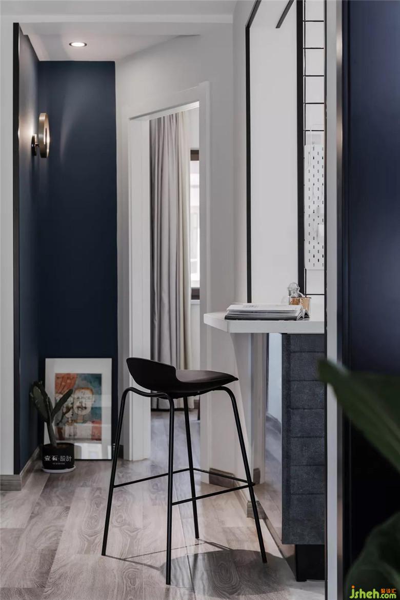 隱與顯。書(shū)房室內(nèi)設(shè)計(jì)師采用半開(kāi)放式設(shè)計(jì),廚房為開(kāi)放式廚房,空間的隱蔽與顯現(xiàn)結(jié)合。重點(diǎn)強(qiáng)調(diào)視覺(jué)和舒適度。書(shū)房的柜子也是嵌入墻體的設(shè)計(jì)方式,規(guī)整空間。
