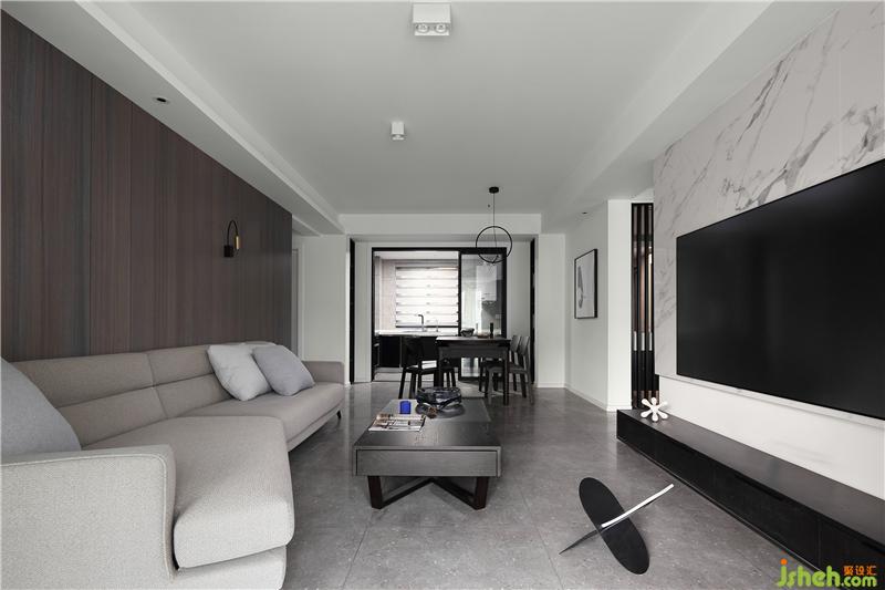 The living room TV background wall adopts white texture marble, and the sofa background adopts dark coffee color decorative panel. The sense of space and advanced texture come from the combination of color and material.