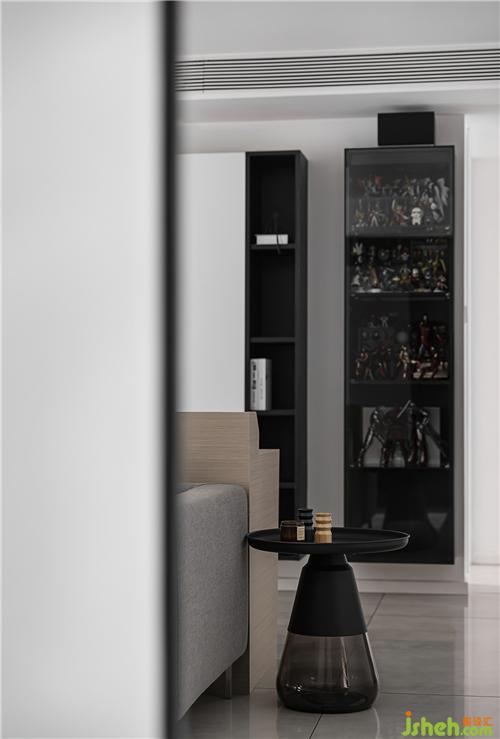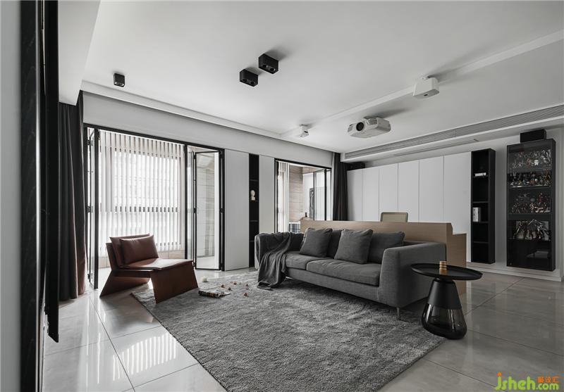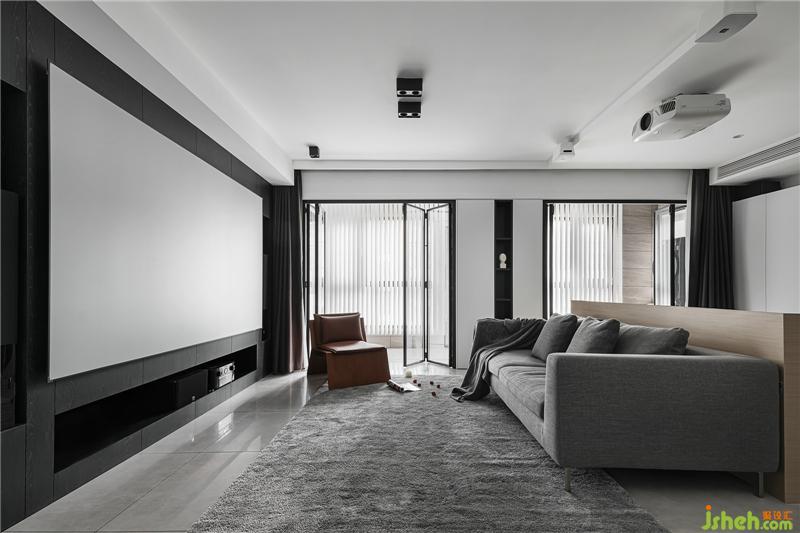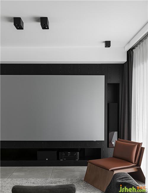 The wall of the living room and the secondary wall of the back are made into the double-sided cabinet design of the back after modification. The secondary storage wardrobe is added, and the cabinet TV background is embedded with projection and audio display.