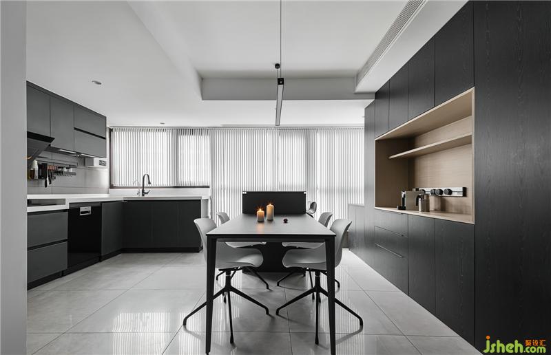 玻璃門劃分廚餐廳和客廳的空間,透露質(zhì)感,也解決了油煙的困擾。