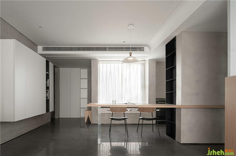 引入建筑設(shè)計(jì)手法,將餐桌與墻體穿插組合,極簡(jiǎn)美觀南京裝修設(shè)計(jì)。