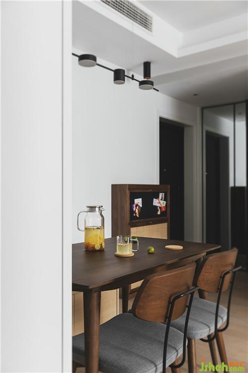 餐廳沿墻而設(shè)卡座,既可作為餐椅,也可用于收納,餐桌餐椅的選擇和進(jìn)門(mén)鞋柜,色調(diào)風(fēng)格相呼應(yīng)。