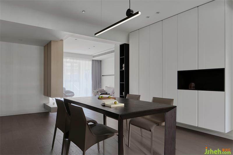 空間秩序感,也體現(xiàn)在對(duì)細(xì)節(jié)處理,餐廳選擇一組皮質(zhì)餐椅,光潔細(xì)膩有品味,也容易打理。