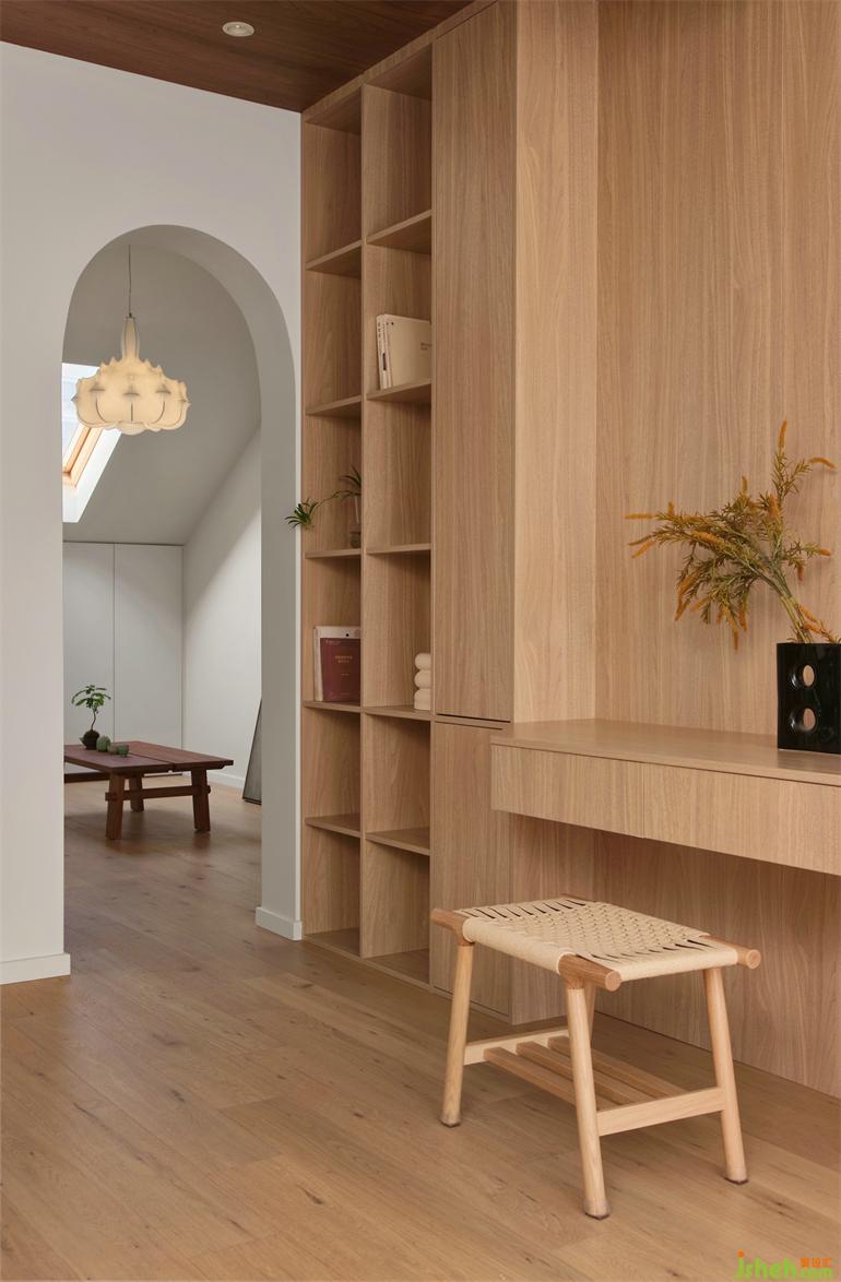 二樓原有露臺(tái)改為客廳,頂部木飾面和墻面木飾面形成方形造景框,復(fù)式裝修設(shè)計(jì)劃分出單獨(dú)的書桌辦公空間,客廳保留了露臺(tái)的部分原始架構(gòu),頂部吊頂隔熱,空間相對(duì)無序,沒有邊界,自由而舒適。
