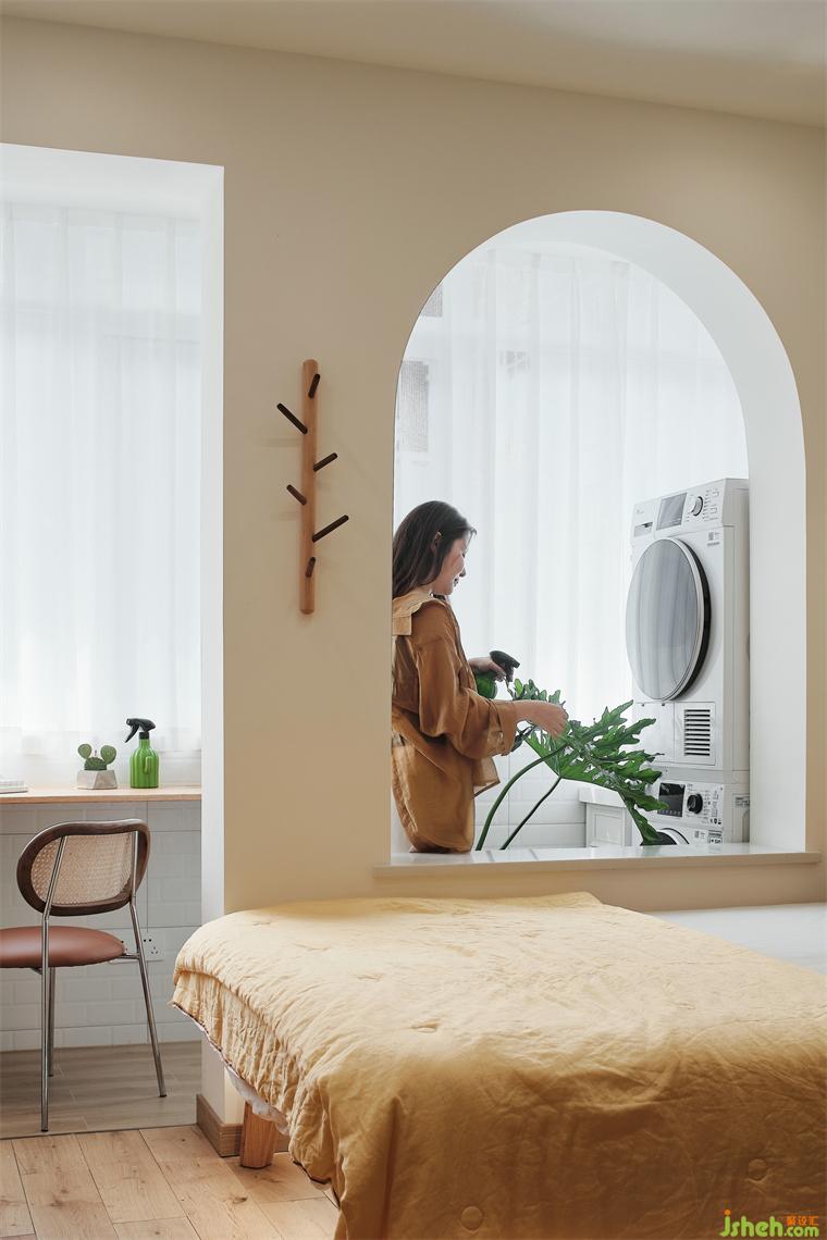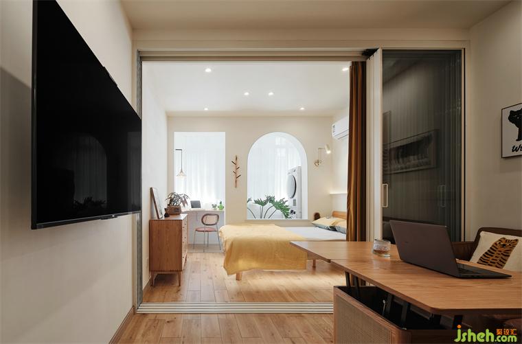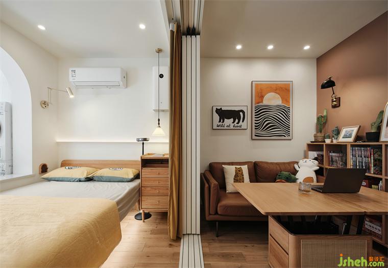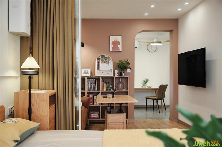主臥看向客餐廳視角,藕粉、原木色、茉莉黃等暖色系組合,裝修公司散發(fā)出自然的溫馨感。
