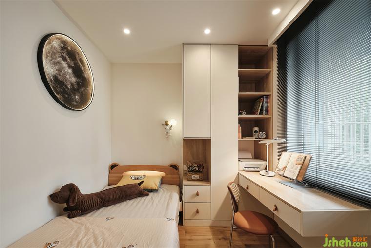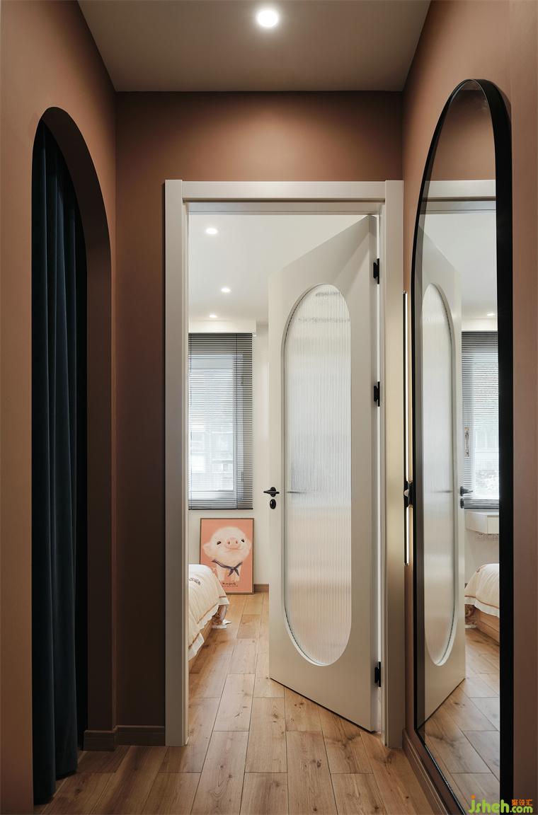 兩間次臥改造成衣帽間和兒童房,藍(lán)色門簾后是儲物式衣帽間,裝修公司對面是一面全身鏡,鏡子還能顯大空間。