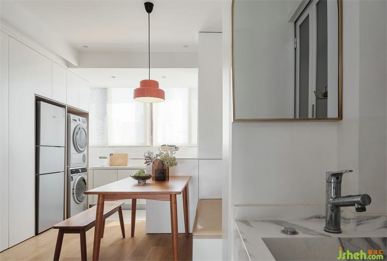 開(kāi)放式廚餐廳,讓空間顯開(kāi)闊,同時(shí)也便于家人互動(dòng),媽媽在廚房準(zhǔn)備食物的時(shí)候,也能看到在公共區(qū)活動(dòng)的孩子。