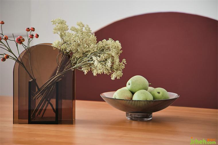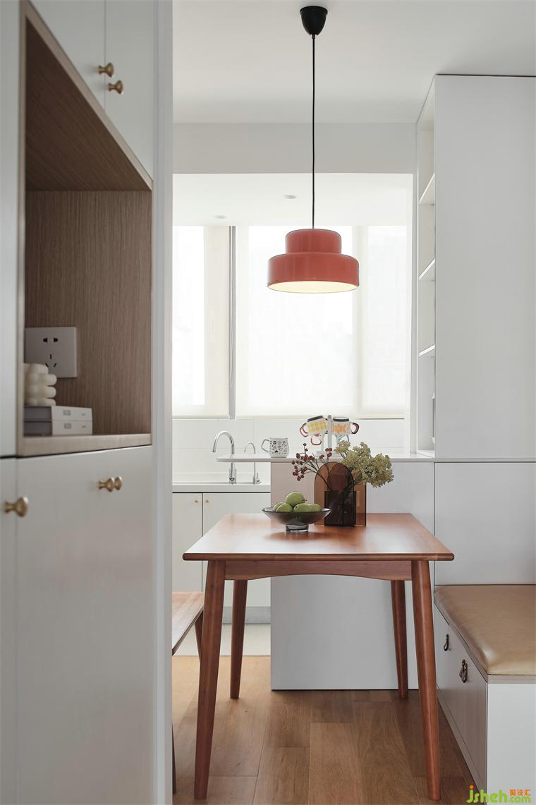 餐廳背景墻做了卡座和局部彩色墻設(shè)計(jì),補(bǔ)充餐椅的功能,節(jié)省空間而且卡座下面還可以儲(chǔ)物。
