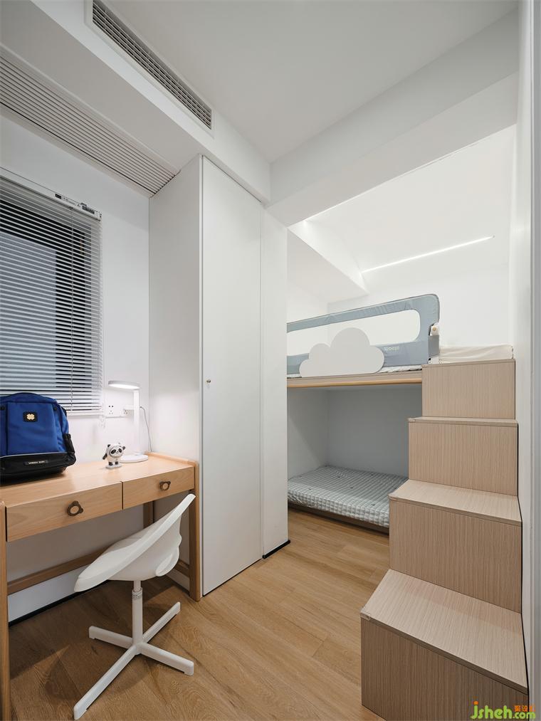 上下鋪設(shè)計(jì),小樓梯也是儲(chǔ)物格子柜。采用木白搭配,裝修公司局部的藍(lán)色點(diǎn)綴,恰好的寧?kù)o。