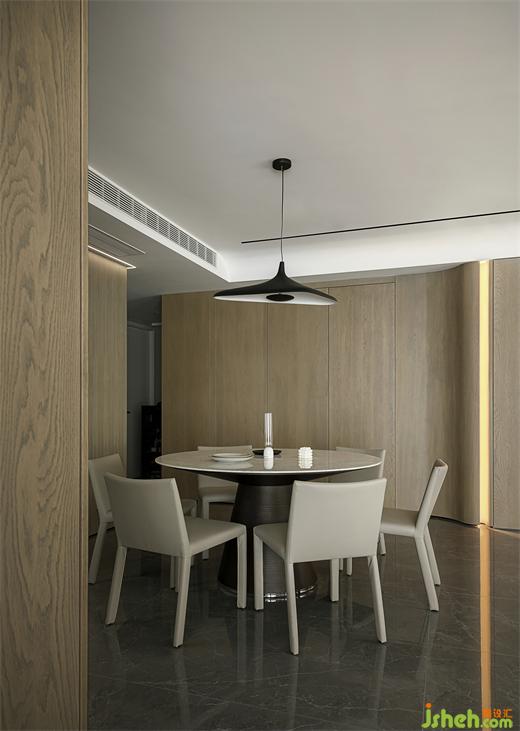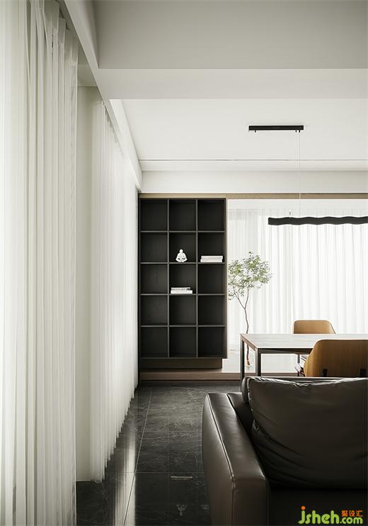 敞開(kāi)式工作學(xué)習(xí)區(qū),利用拐角墻體做了懸空書架,空間更豐富。南京大平層裝修設(shè)計(jì)選用大尺寸方桌,一盞吊燈,讓開(kāi)放式也有了聚攏的氛圍感。女主職業(yè)為老師經(jīng)常帶孩子在此看書學(xué)習(xí)。