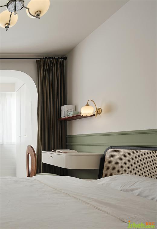 臥室,告別傳統(tǒng)床頭柜,根據(jù)設(shè)計(jì)定制了這樣一款懸浮柜,裝修公司可做女主化妝臺(tái),柜角處還貼心做了弧角,防止磕碰。