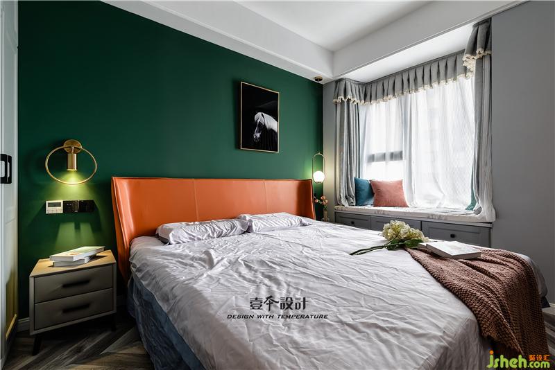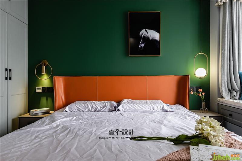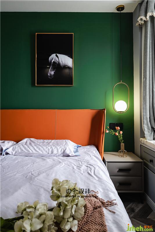 ▲主臥室床頭背景的墨綠色,最近年來(lái)很受歡迎的一種顏色,墨綠色墻面搭配意式輕奢橙色,也比純粹的綠色更加時(shí)尚。橙色的暖,墨綠的冷,恰恰平衡了整個(gè)空間。金色的壁燈又增加了空間的質(zhì)感,讓空間既時(shí)尚又溫馨,這是設(shè)計(jì)者的巧思,更是使用者的品味。
