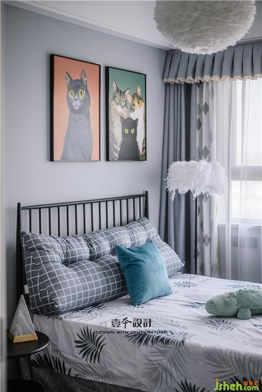 ▲父母房延續(xù)了現(xiàn)代的黑白灰風格,魚骨拼的時尚、灰色的墻面、印著綠葉的床品、彩色的貓咪掛畫、黑色的床背,塑造雅致的同時又給人安靜的愜意感。