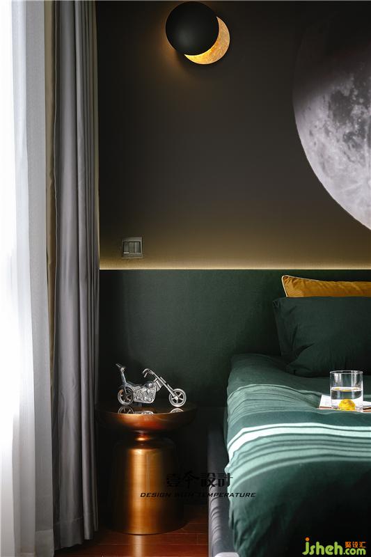沒錯,黑色墻紙正是大家熟知的月球圖案,周導(dǎo)本身既是影視從業(yè)者也是電影發(fā)燒友,設(shè)計階段恰逢電影《流浪地球》的上映,我們一拍即合,當即決定采用太空題材的元素來打造主臥風格。床頭背景墻選用了這一款月球壁紙圖案,壁紙的下面是綠色的皮質(zhì)護墻板,護墻板內(nèi)暗藏燈帶的光線猶如從飛船舷窗內(nèi)望向深邃的太空。墻上的壁燈就好像宇宙中漂浮的星球,加上中間的飛碟主燈,一起散發(fā)出柔和的光線,造型溫情而浪漫。室內(nèi)設(shè)計師