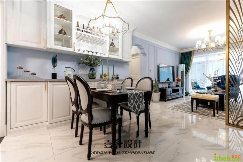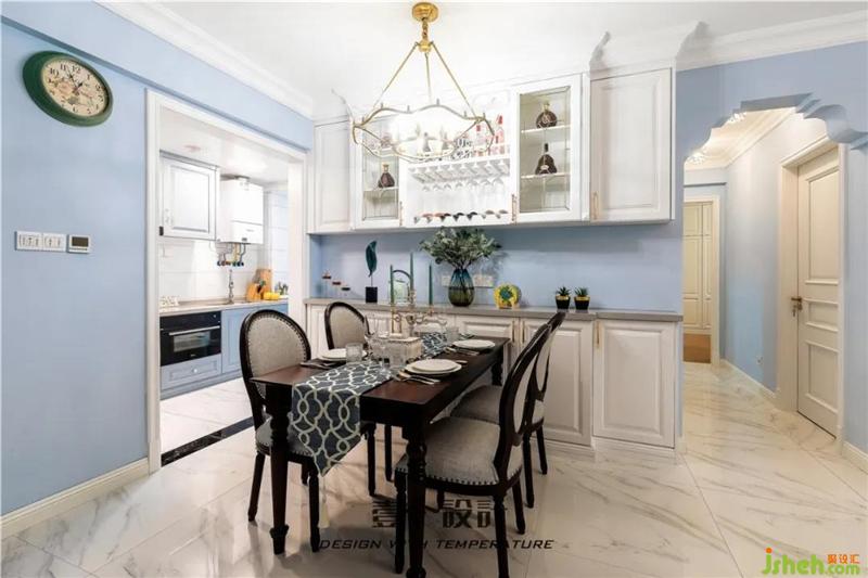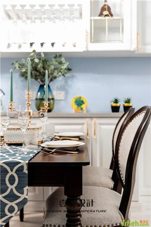 藍(lán)色浪漫一直延續(xù),沉穩(wěn)的木質(zhì)餐桌椅與華麗的水晶吊燈結(jié)合,精致又大方。餐桌旁邊的吊柜和儲(chǔ)物柜,滿(mǎn)足了收納和展示的需求。金色的餐具優(yōu)雅高端,散發(fā)著滿(mǎn)滿(mǎn)的輕奢氣息。
