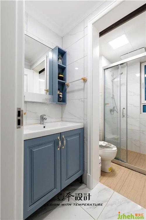 衛(wèi)生間未做硬裝調(diào)整,只是更換了漱洗臺柜門和房門的顏色,藍色柜門干凈清爽,空間也顯得大了起來。