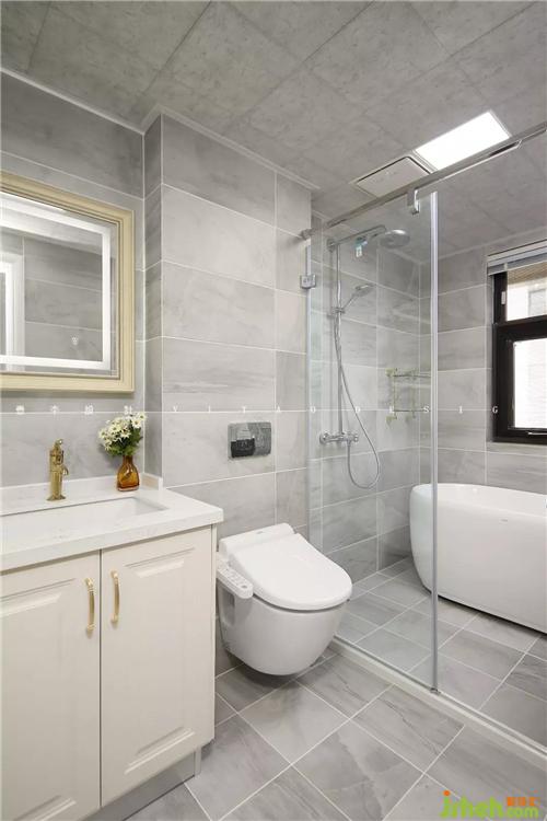 衛(wèi)生間仍然采用灰色的瓷磚,干凈清爽易打理,點綴金色的龍頭、拉手提升品質感。
