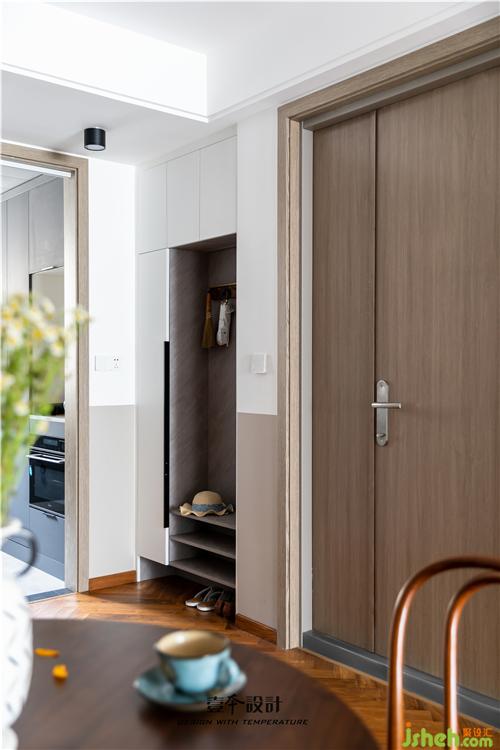 入戶(hù)玄關(guān)簡(jiǎn)單實(shí)用,室內(nèi)設(shè)計(jì)師設(shè)置了換鞋凳,鞋柜底部留空,放常穿的鞋子,換鞋、掛上外套、取下帽子,輕松完成所有換裝動(dòng)作。