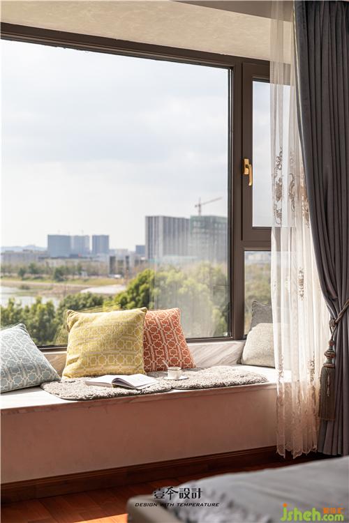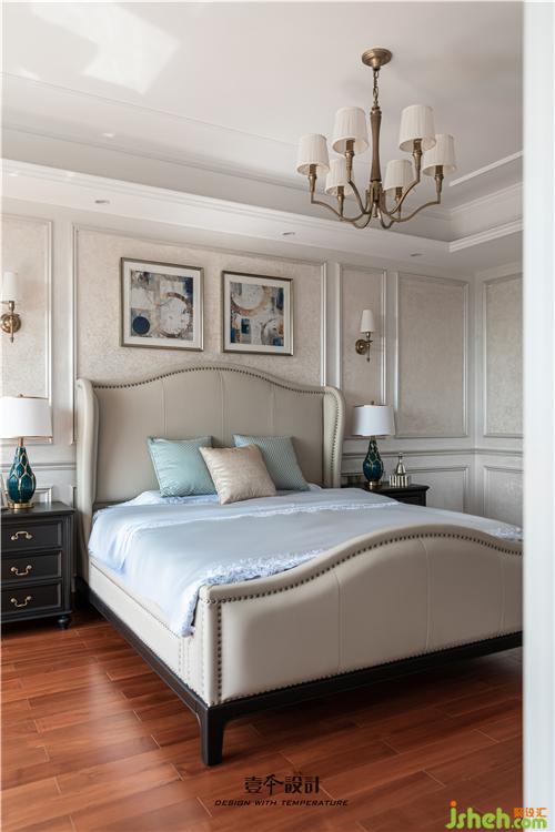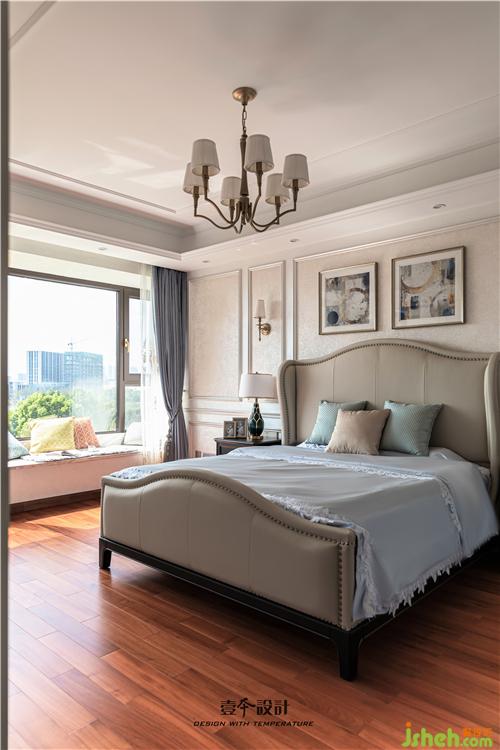 主臥延續(xù)客廳精致優(yōu)雅的風(fēng)格,搭配黑色的床頭柜,擺設(shè)皮質(zhì)靠背的美式床,素簡(jiǎn)的床品與床頭掛畫,為臥室空間增加溫情和舒適。閑暇之余靠坐在飄窗,一本書,一杯咖啡,陽(yáng)光溫暖,愜意整個(gè)下午。