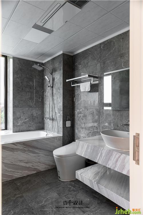 衛(wèi)生間一反其它空間的白色調(diào),以灰色調(diào)瓷磚鋪陳空間,輔以爵士白大理石進(jìn)行搭配,營(yíng)造讓人寧?kù)o而放松的沐浴空間。
