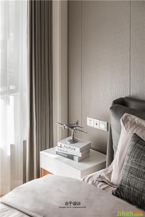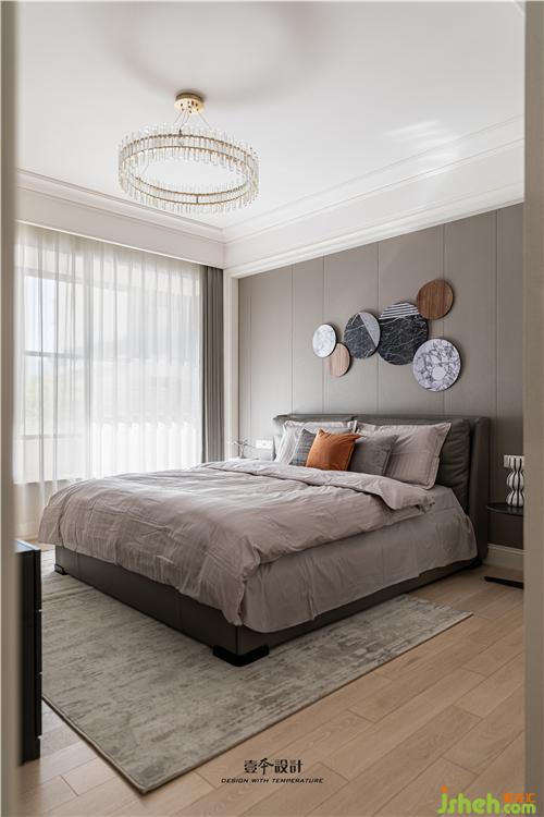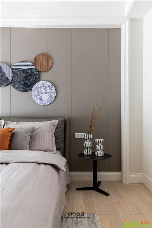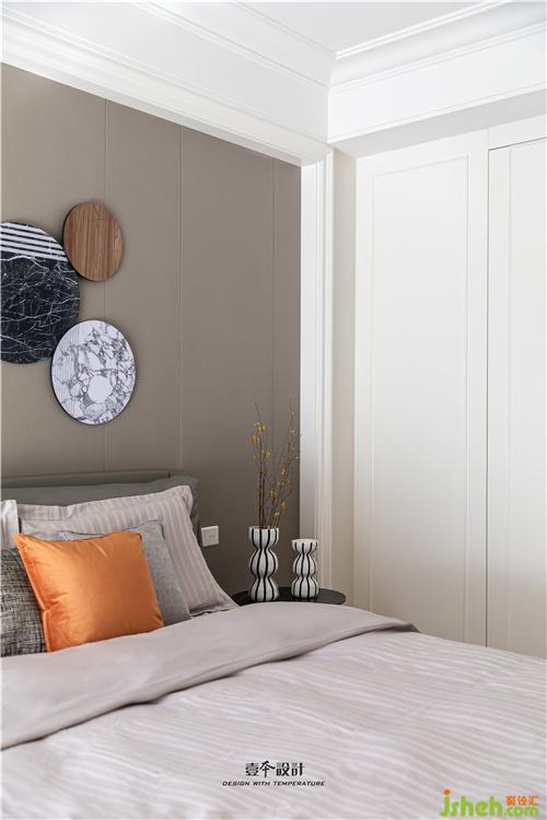 主臥床頭背景保留原造型不做改變,室內(nèi)設(shè)計(jì)師精心選擇一個(gè)點(diǎn)睛的裝飾物來(lái)達(dá)到增色的效果,并通過(guò)床品、家具、窗簾的顏色搭配來(lái)烘托溫暖舒適的睡眠空間。
