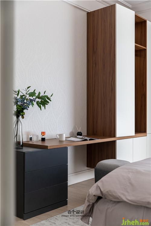 將衣柜與梳妝臺(tái)合二為一,二者通過(guò)大板連接起來(lái),自然而流暢的將女主梳妝臺(tái)與日常的隨手掛放,儲(chǔ)物區(qū)域融為整體。
