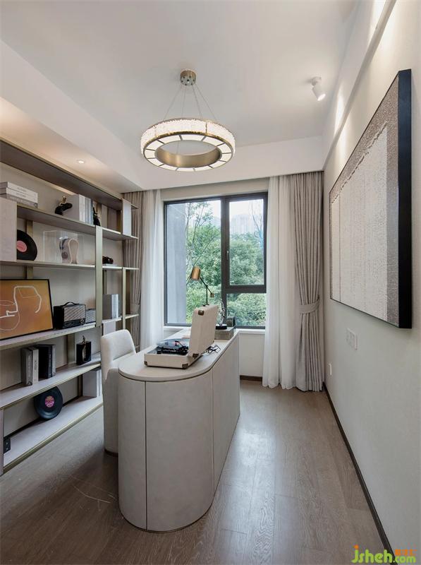 “材料的穿插,讓生活的品質(zhì)感與舒適性娓娓道來。”家具的搭配與墻面相互協(xié)調(diào)、水晶吊燈以及金屬元素的點綴,成就了書房一隅的閱讀時光。每一處設(shè)計的細(xì)節(jié)都有其特色存在,創(chuàng)造出一種輕松、隨意的生活狀態(tài)。