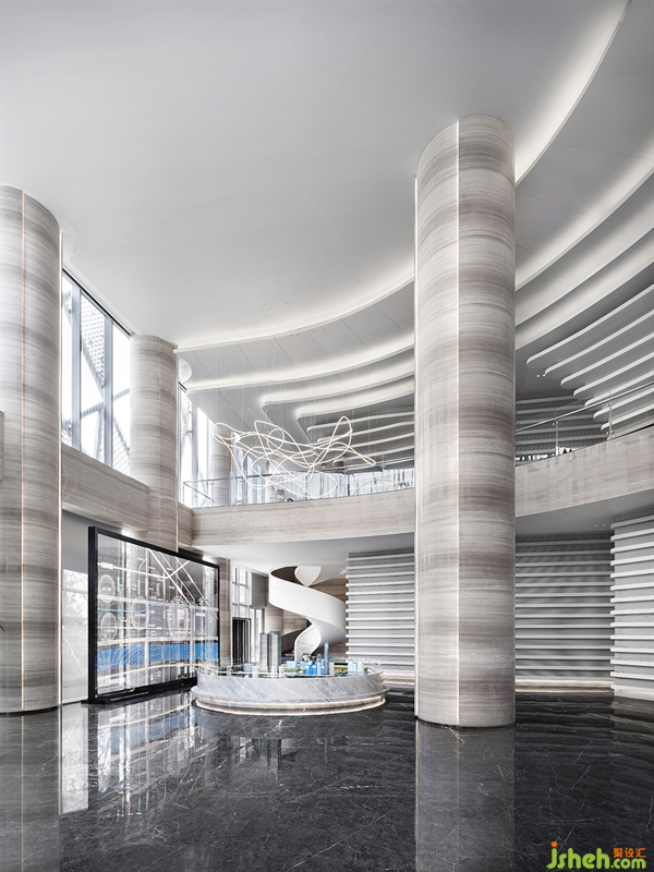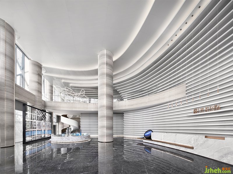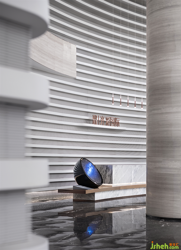 不斷重復(fù)的墻面曲線,疊加起巨大靜態(tài)勢(shì)能,完美烘托項(xiàng)目品牌,低調(diào)卻內(nèi)涵力量感。藍(lán)色的LED裝置,如一只望向宇宙蒼穹的眼睛,將深邃星辰大海納入胸中,引起一段宇宙級(jí)浪漫。水韻星光下,在城市絢爛外的燈火闌珊中,靜聽(tīng)江水濤濤,奔涌千年。