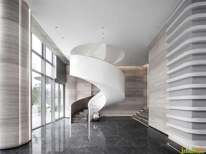 武漢售樓處設(shè)計(jì)空間中曲線的運(yùn)用讓人游弋其中暢行無(wú)阻,一側(cè)端景區(qū)域放置圓形沙盤(pán),配合透明項(xiàng)目地圖,聚合為功能焦點(diǎn),配合頂部自由型線條燈和遠(yuǎn)處的旋梯,凝練成一種未來(lái)感的視覺(jué)形象。