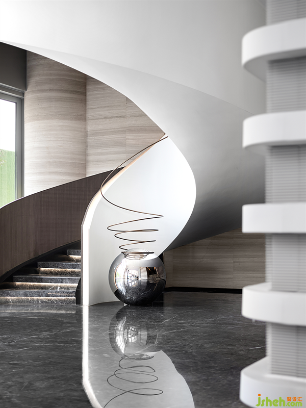 作為樓梯形式中最生動和雕塑感的存在,旋梯引領(lǐng)人全角度看遍風景。武漢售樓處設計空間中嵌入白絲帶般的旋梯,如天鵝之頸優(yōu)雅至極。球形雕塑恰到好處,標定旋梯的軸心,一條金色的螺線盤旋向上,引領(lǐng)人們的視線望上二層。