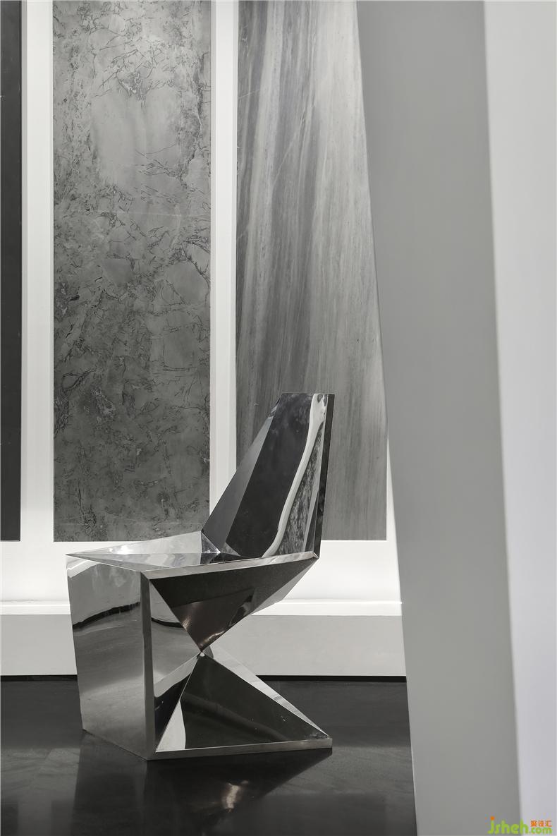 此外,設計師試圖在空間投擲更多有形的「碎片」。室內(nèi)設計師產(chǎn)品看似缺席了,卻又無處不在。大量被切割如同畫卷的石材的有序陳列是其主要表征,它們也被滲透至墻面、桌椅和收納,藝術生長開來